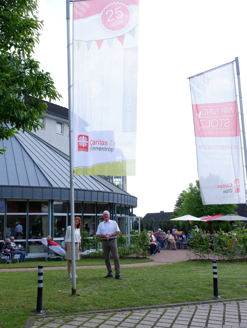 Finnentrop. Das Haus Habbecker Heide feiert 25. Geburtstag! Die Pflegeinrichtung wurde im August 1996 eröffnet. Aus diesem Anlass wurde, in einem kleinen Festakt, feierlich eine Jubiläumsfahne gehisst. Mit einem Gläschen Sekt stießen die Bewohnerinnen, die Bewohner, die Mitarbeitenden, Bea Hartman, Zentrumleitung und Thomas Feldmann, 1. Vorsitzender des Fördervereines Seniorenhaus e.V., auf dieses Jubiläum an. Begleitet wurde der Festakt durch Ingo Schürmann mit seiner Trompete.
