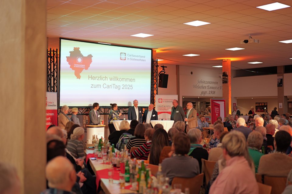 Anfang November feierten die Caritasverbände Olpe und Siegen-Wittgenstein unter dem Motto „Türen auf, Zukunft rein!“ ihren ersten gemeinsamen CariTag. Rund 220 Interessierte, darunter zahlreiche Mitarbeitende aus Hauptberuf und Ehrenamt, waren der Einladung zu Austausch und Begegnung in die Schützenhalle Welschen Ennest gefolgt und verbrachten einen inspirierenden Tag im wertschätzenden Miteinander. Die symbolische „offene Tür“ setzte ein Zeichen für die Fusion beider Verbände zum „Caritasverband in Südwestfalen“ im kommenden Jahr und unterstrich das Ziel, die Stärken beider Regionen zu bündeln und die Zukunftsfähigkeit der Leistungen für die Menschen zu sichern. Die beiden Vorsitzenden der Caritasräte Stefan Hundt (Caritasverband Olpe) und Christoph Ewers (Caritasverband Siegen-Wittgenstein) eröffneten den CariTag gemeinsam.