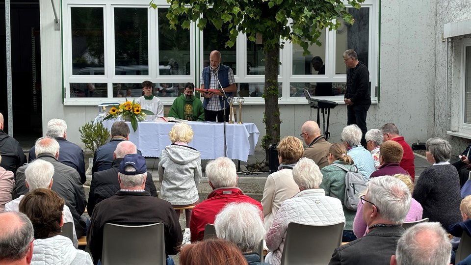 Der Gemeindegottesdienst der St. Mariä Himmelfahrt Pfarrgemende in Olpe auf dem Außengelände der Werthamnn-Werkstätten