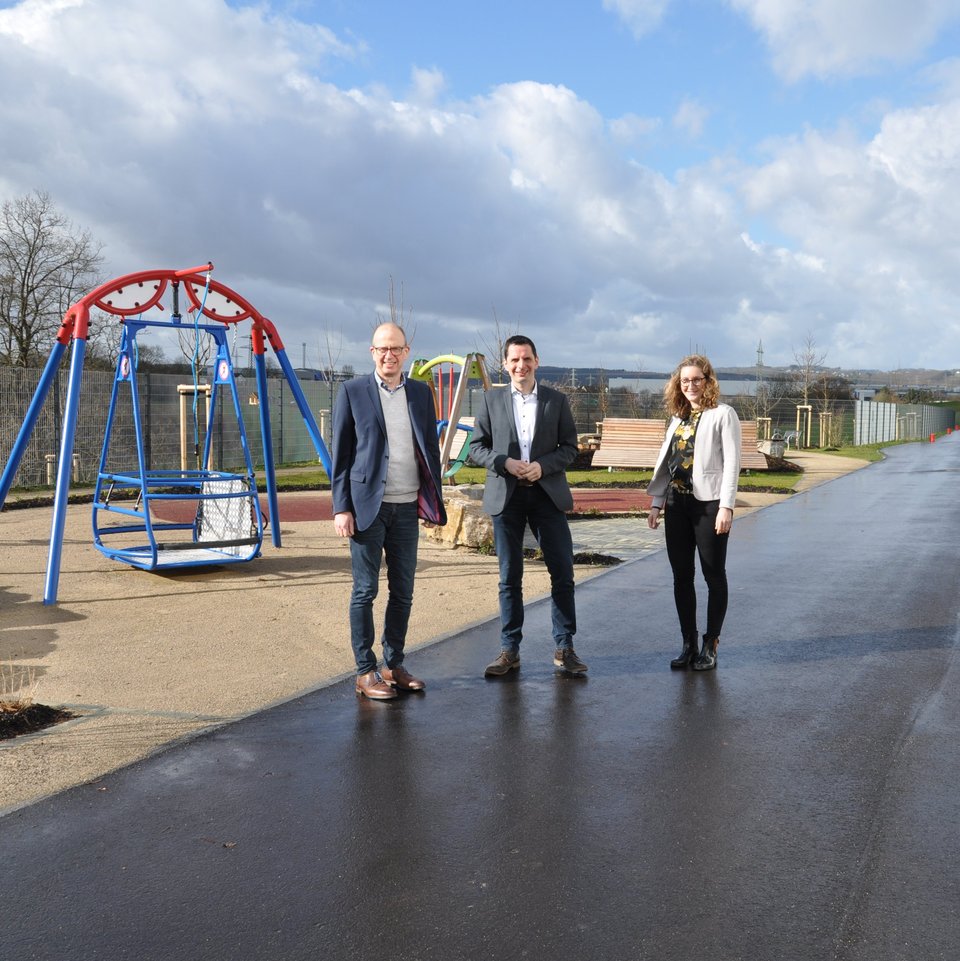 (Foto: von links: Andreas Mönig, Leitung Werkstätten; Bürgermeister Christian Pospischil aus Attendorn, Melanie Schiffer, Abteilungsleiterin, vor dem neu gestalteten Außengelände)