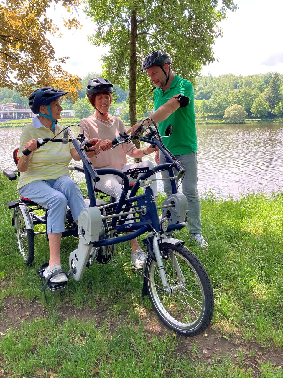 Olpe. Überglücklich starteten die ersten Bewohnerinnen und Bewohner des Caritas-Zentrums Olpe bei strahlendem Sonnenschein die erste Ausfahrt entlang des Bigge-Rundwegs. Bereits im Dezember 2019 konnte dieses speziell auf die Bedürfnisse der Seniorinnen und Senioren zugeschnittene Tandem E-Bike an das Team des Seniorenhauses Gerberweg übergeben werden. Im Januar 2020 erfolgte die offizielle Einweihung des besonderen Gefährtes. Finanziert wurde das Tandem E-Bike durch die Initiatorin Anne Kruk, großzügigen Spendern und dem Förderverein für das Caritas-Zentrum Olpe e.V.