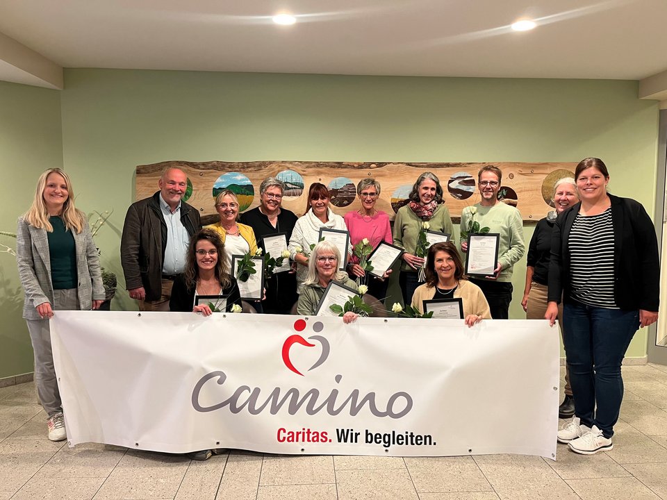 Christoph Becker (2. v. l.) vom Vorstand des Caritasverbandes überreichte gemeinsam mit Caterina Breuer von Camino (1. v. l.) die Zertifikate an die Absolventinnen und Absolventen.