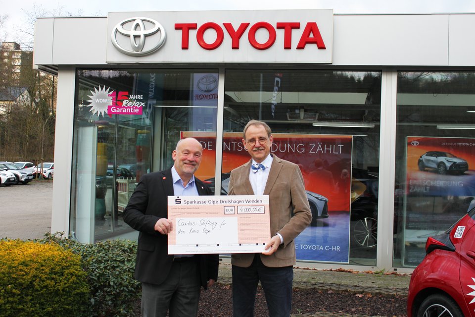 Seit einem Vierteljahrhundert ist das Autohaus Keller Partner von Toyota in Olpe. Das Silberjubiläum nutzte das Autohaus-Team, um die Caritas-Stiftung für den Kreis Olpe mit einer großzügigen Spendenaktion zu unterstützen. „Wir fühlen uns der Idee der Caritas-Stiftung seit jeher verbunden“, so Wolfgang Keller, Geschäftsführer vom Autohaus Keller GmbH & Co. KG. im Zuge der symbolischen Scheckübergabe in der Olper Filiale im Osterseifen.