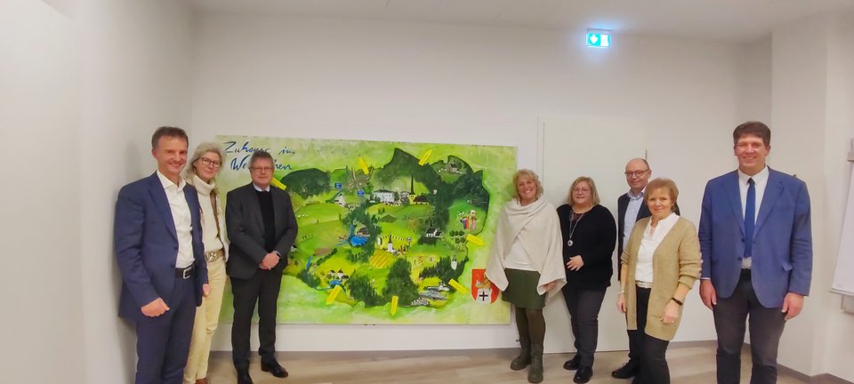 In der Caritas-Tagespflege Wenden wurde kürzlich eine lang erwartete Spende entgegengenommen: Dank großzügiger Unterstützung der Sparkasse ODW ist der Eingangsbereich der Tagespflege nun mit einem tollen Gemälde der Künstlerin Ilona Weber bereichert. Der großformatige Blickfang zeigt farbenfroh die Gemeinde Wenden mit allen zugehörigen Gemeindeteilen.