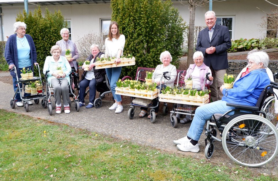 100 Osterglocken leuchten gelb auf dem Wagen im Eingangsbereich des Haus Habbecker Heide und finden schon hier große Bewunderung. Thomas Feldmann, Vorsitzender des Fördervereins übergab am Gründonnerstag den blumigen Ostergruß an die Bewohnerinnen und Bewohner des Haus Habbecker Heide und an die Mieterinnen und Mieter des angeschlossenen „Service-Wohnen Finnentrop".