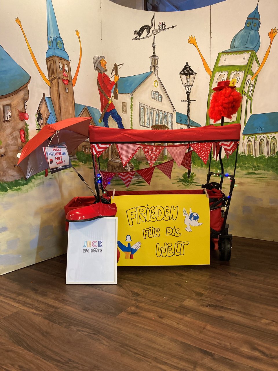 Aufgrund des Kriegsgeschehens in der Ukraine möchten wir ein Zeichen der Solidarität setzen und haben unseren „Mini-Wagen“ in einen Friedenswagen umgewandelt. So steht er nun in der Karnevalskulisse im Seniorenhaus St.Liborius und wir alle denken an, hoffen auf und beten um Frieden.