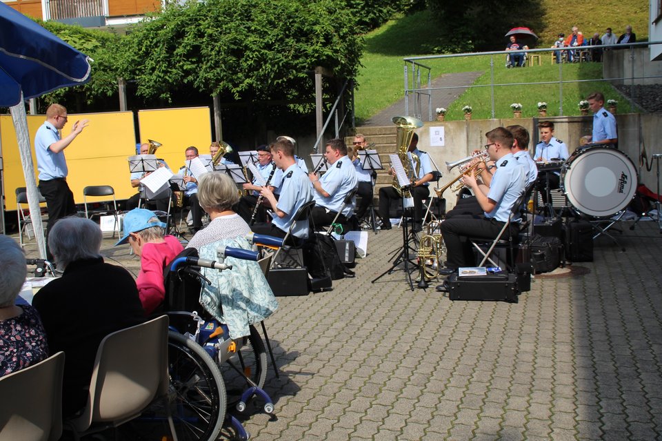 Elspe. Am vergangenen Wochenende konnte das schon traditionelle Frühschoppenkonzert im St. Franziskus-Seniorenhaus in Elspe nach einem Jahr Corona-Pause endlich wieder stattfinden. Draußen im Hof wurden große Zelte aufgebaut, die für die passende Feststimmung sorgten. Bei angenehmen Sommertemperaturen nahmen die Bewohnerinnen und Bewohner, sowie die ehrenamtlich Mitarbeitenden erwartungsvoll an den Tischen Platz. Auch die Musiker des Elsper Musikcorps 1880 e.V. unter der Leitung von Julian Jaspers freuten sich darauf endlich wieder live und vor Publikum spielen zu dürfen. Mitgebracht hatten sie Musikstücke für jeden Geschmack. Zu hören gab es zünftige Märsche, bekannte Oldies und Schlager, die zum Mitsingen und Mitklatschen einluden. Immer wieder gab es lauten Zwischenapplaus. In den Pausen wurden unterhaltsame Texte vorgetragen, die ein ehrenamtlicher Mitarbeiter extra gedichtet hatte. Aber natürlich dürfen bei einem zünftigen Frühschoppen auch nicht die Kaltgetränke und ein leckeres Essen fehlen. Die Hauswirtschaft hatte eine herzhafte Pilzpfanne gezaubert und es gab frische Grillwurst und Kartoffelsalat. Zur passenden Musik schmeckt so ein Essen doppelt so gut. Nach zwei Stunden endete das Konzert mit einem tosenden Applaus für die Musiker, die in viele strahlende und begeisterte Gesichter schauten. Die Bewohner und Mitarbeitenden haben das Fest sehr genossen und freuen sich schon auf eine Wiederholung.
