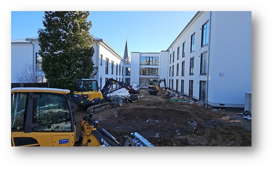 Derzeit entstehen oberhalb der Pfarrkirche 27 barrierefreie Service-Wohnungen (35-91 m²) für Seniorinnen und Senioren ab Pflegegrad 1 sowie eine ambulant betreute Wohngemeinschaft mit elf Plätzen für Menschen ab Pflegegrad 2. Die Wohnungen werden im März 2026 bezugsfertig sein, die WG im April. Ein Café als Treffpunkt für alle Generationen rundet das wertvolle Angebot ab.