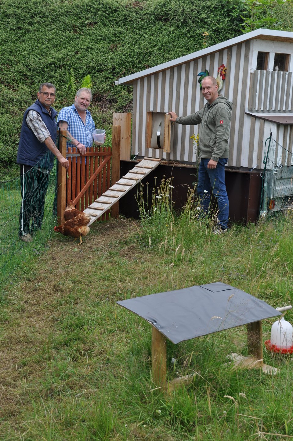 (Bild: Das Hühner-Projekt macht tierischen Spaß“, finden die beiden „Hühnerväter“ sowie Andreas Niklas (re.), der das Projekt im Herrnscheider Weg mitbetreut.)