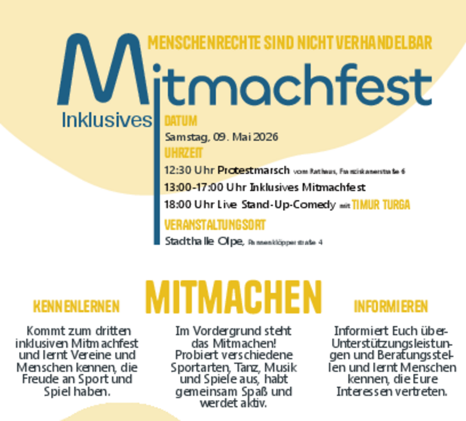 Am Samstag, den 09. Mai 2026, findet in der Stadthalle Olpe das dritte inklusive Mitmachfest statt. Unter dem Motto „Menschenrechte sind nicht verhandelbar“ erwartet Sie von 13:00 bis 17:00 Uhr ein vielfältiges Programm zum Kennenlernen, Mitmachen und Informieren.Freuen Sie sich auf zahlreiche Mitmachaktionen aus den Bereichen Sport, Tanz, Musik und Spiel sowie auf Begegnungen mit Vereinen, Initiativen und Menschen aus der Region. Informieren Sie sich zudem über Unterstützungsangebote und Beratungsstellen.