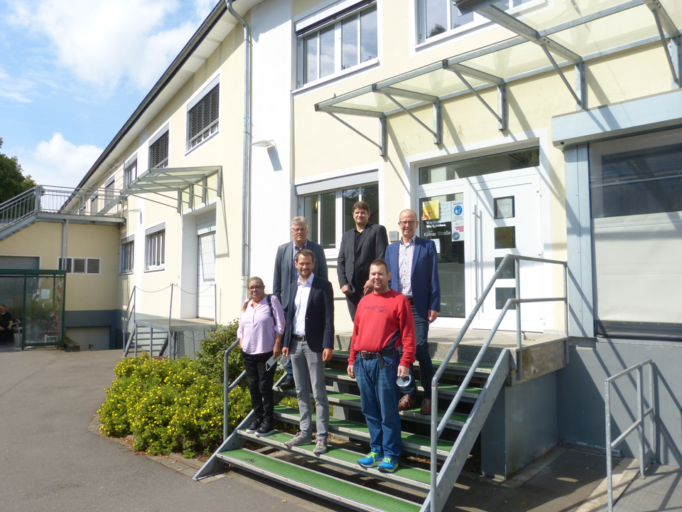 (Foto: von links: Luise Schröder, Werkstattrat; Achim Scheckel, Abteilungsleitung; Johannes Vogel, MdB; Frank Rupprecht, Teamleiter; Peter Noswitz, Werkstattrat und Andreas Mönig, Werkstattleiter)