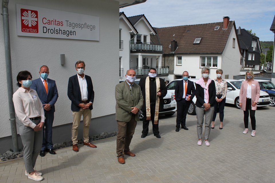 „Denen nah sein, die Hilfe bedürfen“, brachte Pfarrer Markus Leber in seinen Worten die Caritas-Maxime auf den Punkt. Angebunden an eine gute Infrastruktur freuen sich die Mitarbeitenden der Caritas-Station und Caritas-Tagespflege ihren Kunden künftig wohnortnah umfassende Unterstützungsleistungen aus einer Hand anbieten zu können. Wenn demnächst die Tagespflege ihre Pforten öffnet, werden 13 Tagespflegegäste an bis zu sechs Tagen in der Woche in den barrierefreien Räumlichkeiten eine abwechslungsreiche Tagesgestaltung entsprechend ihren Bedürfnissen erfahren. „Mit unserer Einrichtung schließen wir die Versorgungslücke zwischen der häuslichen Versorgung durch Angehörige, einem ambulanten Pflegedienst und einer stationären Betreuungs- und Wohnform“, freut sich Barbara Hahn auf den offiziellen Startschuss der Caritas-Tagespflege in Drolshagen. Der Segen erreichte auch die Elektro-Smarts des Caritasverbandes, so dass einer „Fahrtaufnahme“ zuversichtlich entgegengeblickt wird.