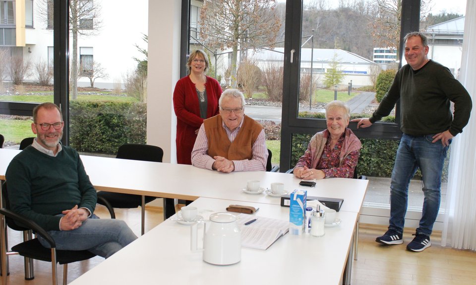 (Bild: Ein Wohnangebot, das Sicherheit und Gemeinschaft garantiert – das versprechen die Verantwortlichen um Uli Mertens, Alexandra Invernizzi und Frank Decker (v.li.): Brigitta und Klaus-Erich Quicker (Mitte) schätzen die Unterstützungsleistungen der Caritas.)