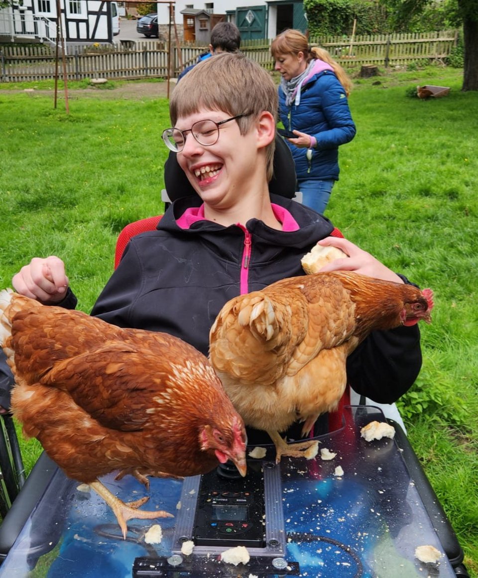 Einen Tag lang konnten die Menschen mit Handicap den Hof rund um das 200 Jahre alte Fachwerkhaus und die vielen landwirtschaftlichen Themen kennenlernen und live erleben. Neben dem Erkunden vom Kuhstall und vielen Infos rund um die Stallarbeit standen auch die Versorgung der Hühner und Ziegen sowie das Herumführen von zwei Pferden auf dem Programm. Nicht nur die Menschen mit Behinderung freuten sich, die Tiere füttern und so nah erleben zu dürfen. Auch einige Hühner genossen den „Kuschelkurs“ und machten es sich auf dem Rollstuhl einer Beschäftigten bequem.