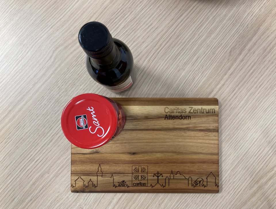 Zum Abschluss erhielten die ehrenamtlich Mitarbeitenden ein Geschenk als Zeichen des Dankes, welches ein Marmeladenglas (für besondere Momente) als auch eine bleibende Erinnerung in Form eines extra angefertigten Frühstücksbrettchens mit dem Caritas-Flammenkreuz in der Mitte der Attendorner Brauchtümer - genau dort findet ehrenamtliche Tätigkeit auch statt: Mittendrin.
