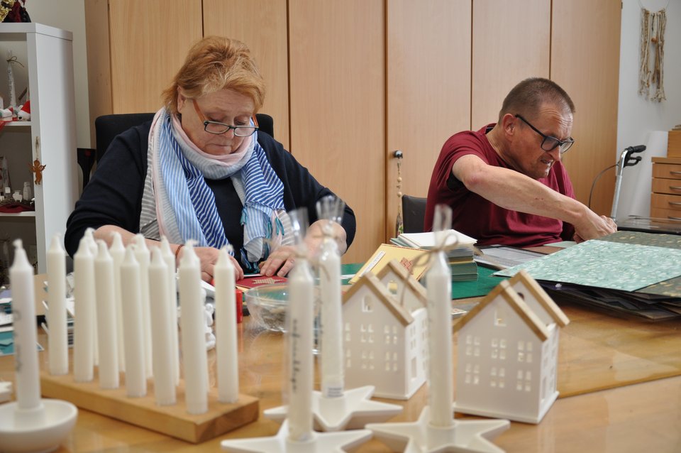 „Von ersten Zuschnitten über das Stanzen, Kleben bis hin zur letzten Kontrolle und dem Versand an unsere Kunden aus nah und fern – unsere Zuarbeit untereinander funktioniert bestens“, berichtet auch Rüdiger Jahn, der seit einigen Jahren bei SeniorRA kreativ arbeiten darf. „Die Produktion zu Weihnachten macht mir aufgrund der Vielfältigkeit große Freude und gibt mir die Möglichkeit, eigene Stärken und mehr Eigenständigkeit zu entwickeln.“ Für Teamleitung Kerstin Stahlhacke ist die Weihnachtsproduktion jedes Jahr was ganz besonderes. „Zu sehen, was die Beschäftigten dort Hand in Hand erschaffen ist wirklich bewundernswert. Sie organisieren ihre Arbeitsaufträge nach individueller Einarbeitung weitestgehend selbstständig und wissen ganz genau, was zu tun ist“, so Stahlhacke beeindruckt. „Während ich in meiner Arbeitsgruppe als Anleitung fungiere, werde ich in der SenioRa zum ‚Azubi‘ und durch unsere Beschäftigten angelernt“, ergänzt sie anerkennend. Das Ziel, die Selbstständligkeit der Beschäftigten stets zu fördern, werde in der Weihnachtskartenproduktion jedes Jahr auf‘s neue erreicht. Verkauft werden die unterschiedlichsten Artikel zum einen am Standort der Werkstatt auf dem Askay selbst, aber auch extern bei Hoff‘s Wertvoll in Bilstein und anderen Firmen.