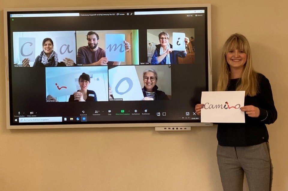 Foto: Der Qualifizierungskurs findet erstmalig im neuen Format an drei Standorten statt. Die Camino-Koordinatoren freuen sich, Interessierte am Informationsabend kennenzulernen. (v.l.n.r. obere Reihe im Bildschirm: Tanja Hilden, Nicolai Quast, Anne Böhler, untere Reihe im Bildschirm: Nina Fecker, Gertrud Dobbener, neben dem Bildschirm: Caterina Breuer)