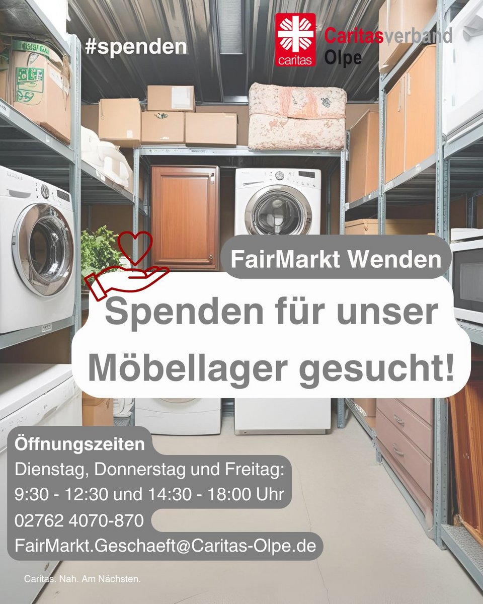 Im Möbelladen des FairMarktes des Caritasverbandes werden gut erhaltene Möbelstücke, Elektro- und Haushaltsgeräte zu fairen Preisen angeboten – für Menschen mit kleinem Geldbeutel, Familien in Not und alle, die nachhaltig und bewusst einkaufen möchten. Doch aktuell ist das Lager leerer denn je. „Wir brauchen dringend Ihre Unterstützung. Jede Spende hilft – direkt und vor Ort“, richtet Christian Seesing vom FairMarkt-Team einen Aufruf an die Bevölkerung aus nah und fern. „Gerade in Zeiten steigender Lebenshaltungskosten möchten wir unseren Kundinnen und Kunden ein faires, bezahlbares Einkaufserlebnis bieten.“