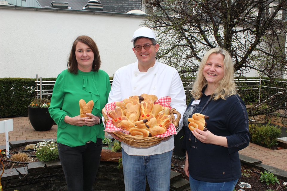 Die sozial engagierte Olper Bäckerei unterstützt seit langer Zeit das Caritas-Zentrum Olpe zum Osterfest. „In den letzten zwei Jahren konnten wir diese Aktion coronabedingt nicht umsetzen und ich freue mich sehr, dass wir die Tradition nun wieder aufleben lassen können“, erklärt Anke Middendorf, Pflegedienstleiterin der Caritas-Station Olpe. Andreas Zinke ließ es sich nicht nehmen, persönlich eine Kostprobe im Caritas-Zentrum Olpe vorbeizubringen. Der Bäckermeister erklärt dabei: „Wir haben einen speziellen Teig kreiert. Die Zutaten sind gut verträglich und auch für Diabetiker bekömmlich.“ Anke Middendorf und Nathalie Klawunder kamen bereits in den Genuss einer Kostprobe.