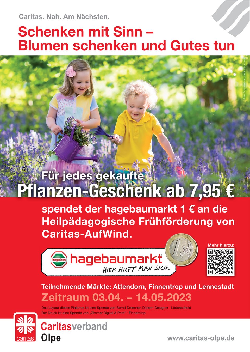 Gutes tun wird bunt: Mit dem Frühling steigt die Lust, Pflanzen zu kaufen, den heimischen Garten auf Vordermann zu bringen und seinen Liebsten mit Blumengeschenken eine Freude zu bereiten – nicht nur zum anstehenden Osterfest. Die florale Spendenaktion der regionalen Hagebaumärkte bietet vom 3. April bis einschließlich 14. Mai beste Gelegenheit zum „Schenken mit Sinn“. In diesem Zeitraum unterstützen die Fachmärkte in Attendorn, Finnentrop und Lennestadt pro gekauftem Pflanzengeschenk ab 7,95 € die Heilpädagogische Frühförderung von Caritas-AufWind mit je 1 €.