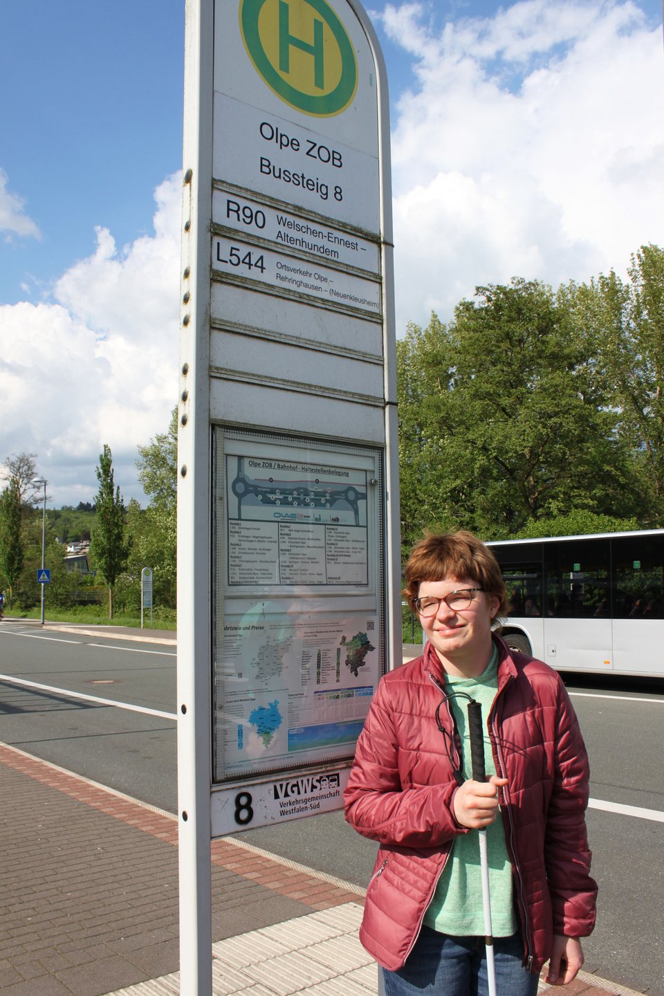 Die sehbehinderte Frau ist auf den ÖPNV angewiesen, fährt früh morgens mit dem Bus in einem Ortsteil von Kirchhundem los und kommt abends sehr spät wieder nach Hause – mehrfaches Umsteigen inklusive. „Eine echte Belastung“ für die sehbehinderte Frau. „Wenn dann ungeplante Busausfälle und schlechte Wetterverhältnisse hinzukommen, bin ich aufgeschmissen und sitze schon mal an der Haltestellt fest.“ Und dass, obwohl sie sich selbst schon als „wandelnden“ VWS bzw. ÖPNV-Fahrplan bezeichnet.