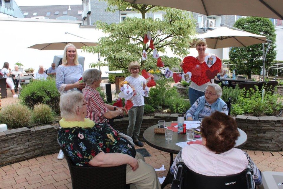 Anna und ihre Mutter haben über die lokale Presse zur Teilnahme an der „Herz-Wimpel-Aktion“ des Vereins Fontanherzen e.V. aufgerufen. Diesen Aufruf hat auch die Mitarbeiterin Claudia Mund bewegt und ihn als Anlass genommen, die Bewohnerinnen und Bewohner des Seniorenhauses Gerberweg dafür zu begeistern. Unermüdlich wurden in den vergangenen Wochen 500 Herzen ausgedruckt, ausgeschnitten, bemalt, mit Sprüchen versehen und liebevoll gestaltet. Mehr als 100 Meter Wimpel-Kette schmücken seitdem die Flure des Seniorenhauses. Jetzt konnte Anna Schröder, Mitarbeiterin des Sozialen Dienstes, die Herzen an ihre Namensvetterin Anna und ihre Mutter übergeben. Da Herzen aus Papier vergänglich sind, gestaltete Renate Straßburger aus Wenden ein ganz spezielles Herz als Erinnerung an diesen Tag. Die Künstlerin ist zudem ehrenamtlich im Caritas-Zentrum tätig.