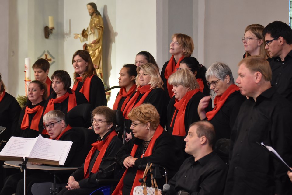 Mit seiner Ankündigung, dass die Gäste ein Feuerwerk der bunten Musik und einen Abend, der sich sehen und hören lassen kann, erleben, hatte Andreas Mönig, Leiter der Werthmann-Werkstätten des Caritasverbandes Olpe nicht zu viel versprochen – und vielleicht sogar noch untertrieben. Es waren fantastische Liedvorträge mit fulminanten Solisten, die nach jedem Stück mit frenetischem Applaus belohnt wurden. Andreas Mönig betonte: „Für die Sängerinnen und Sänger war die Zeit der Pandemie eine schwere Zeit. Ich wurde fast täglich gefragt, wann die Proben wieder möglich sind. Für jeden Einzelnen hat der Chor – der zum Werkstattalltag gehört – eine hohe Bedeutung.“ Und das wurde auch deutlich. Sichtlich konzentriert mit ansteckender Freude ließen die Sängerinnen und Sänger ihre Stimmen erklingen.