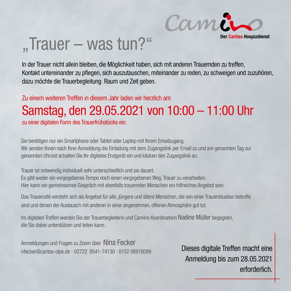 Im digitalen Treffen werden Sie der Trauerbegleiterin und Camino Koordinatorin Nadine Müller begegnen, die Sie dabei unterstützen und leiten kann. Vielleicht haben Sie Lust, bei uns einfach mal dazuzukommen oder Sie erzählen es Interessierten weiter.