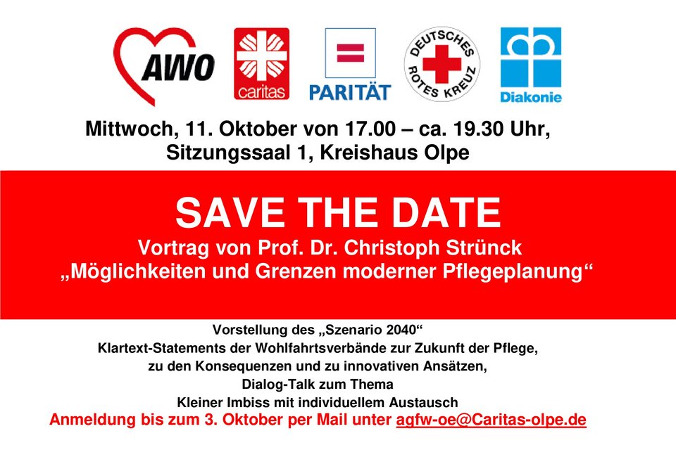 Klartext und Konsequenzen zum Umgang mit dem Pflege- und Betreuungskollaps spricht die Arbeitsgemeinschaft der Freien Wohlfahrtspflege am 11. Oktober im Olper Kreishaus an. Leistungsgrenzen von Dienstleistungen im sozialen Bereich werden an allen Ecken und Enden deutlich. Schon jetzt ist es so, dass nicht mehr jede Pflege- oder Betreuungsanfrage bedient werden kann. Bis zum Jahr 2040 wird der Bedarf demographiebedingt um weitere 30% steigen, die verfügbaren Personalkapazitäten werden jedoch nur noch lediglich 50% des Bedarfes abdecken können.