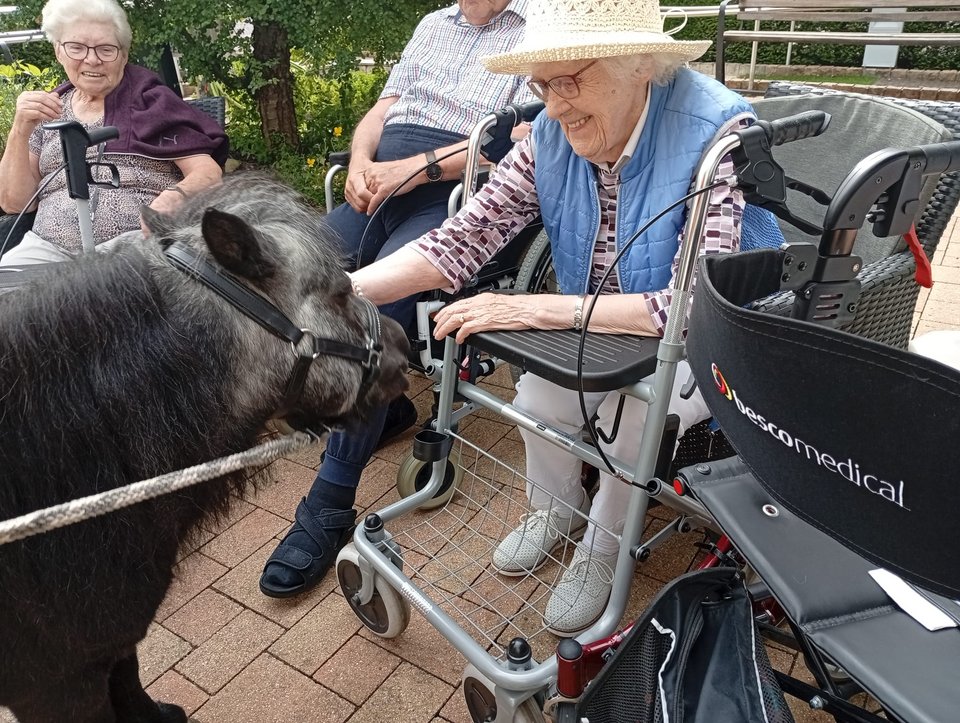 Bei strahlendem Wetter durften die Ponys nach Herzenslust gestreichelt und gefüttert werden. Viele der Seniorinnen und Senioren ließen es sich nicht nehmen, Möhrenstücke und Apfelschnitzel zu reichen – ein Vergnügen nicht nur für die Tiere, sondern auch für die Bewohnenden des Hauses. Die Nähe zu den Tieren rief bei einigen Erinnerungen an frühere Zeiten wach. Schnell entwickelten sich lebhafte Gespräche und berührende Erzählungen über Kindheitserlebnisse, frühere Haustiere oder das Leben auf dem Land.