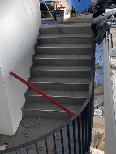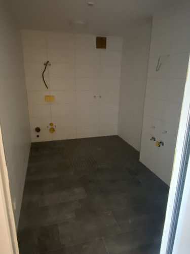 Der Estrich trocknet zur Zeit und auf den oberen Etagen sind sogar die ersten Fliesenleger aktiv gewesen. Nach der heutigen Begehung kann man sich den Look and Feel der zukünfitgen Bäder schon ganz gut vorstellen: großflächige, dunkle Fliesen am Boden und helle Wandfliesen werden für ein modernes Ambiente sorgen.